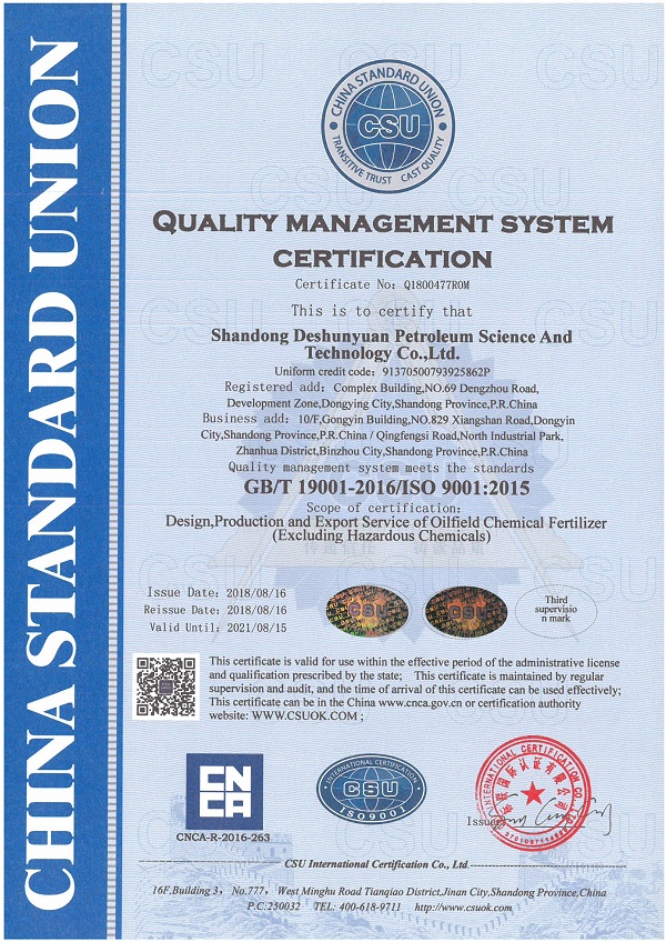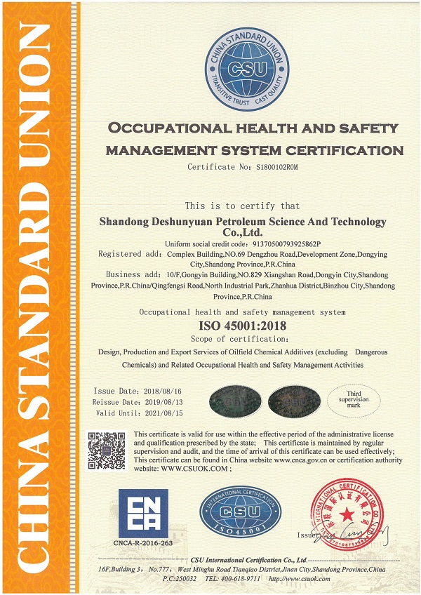 On August 19, 2020, the notice from CSU INTERNATIONAL CERTIFICATION CO., LTD., shows that Shandong Deshunyuan Petroleum Sci& Tech. Co., Ltd has successfully passed the second external supervision and audit of quality, environment and occupational health and safety management system certification. The management systems meet the requirements of standard, therefore the company will continue to maintain the certifications registration qualification, and the certificates continue to be valid as well.