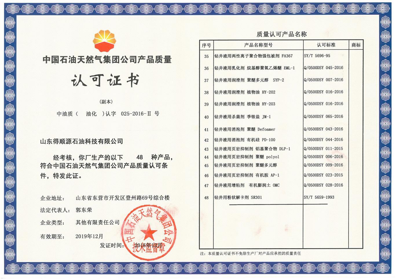 2018年公司新研發(fā)的兩個產(chǎn)品:(1)鉆井液用防塌封堵劑 納米聚酯NP-1和(2)鉆井液用降濾失劑 磺酸鹽共聚物DSP-1成功增加到中石油產(chǎn)品質(zhì)量認(rèn)可證內(nèi)。截止目前,公司在中石油產(chǎn)品質(zhì)量認(rèn)可證范圍內(nèi)的產(chǎn)品已經(jīng)增加至50個產(chǎn)品。