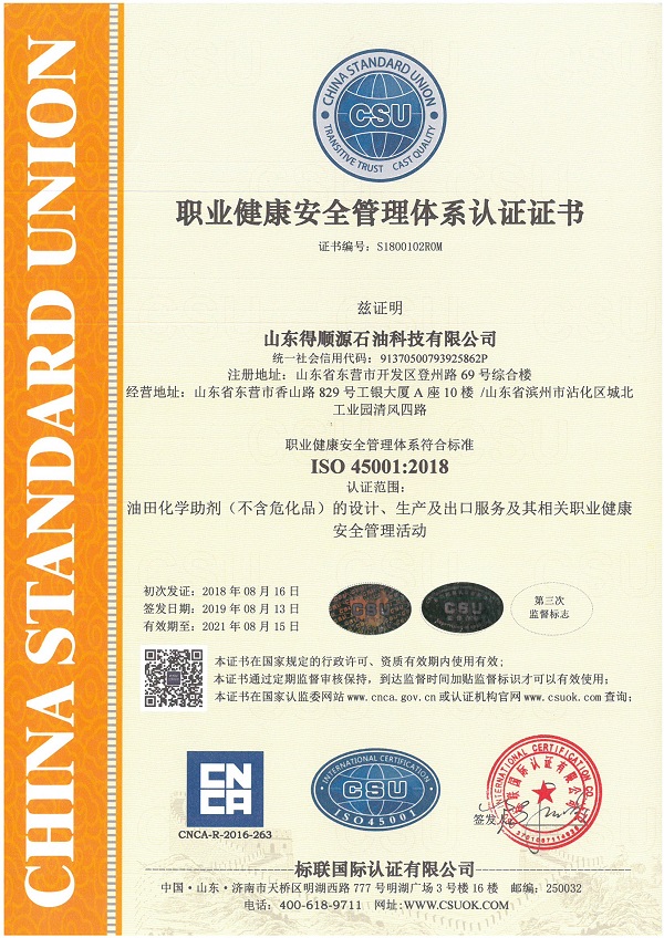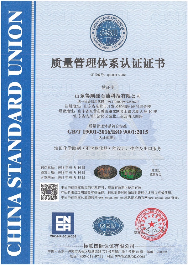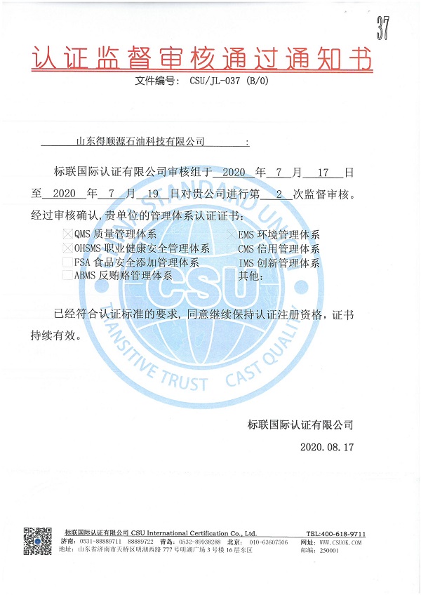 2020年8月19日,公司收到標聯(lián)國際認證有限公司通知,順利通過了質(zhì)量、環(huán)境及職業(yè)健康安全管理三體系認證的第二次外部監(jiān)督審核,公司的管理體系符合認證標準的要求,同意繼續(xù)保持認證注冊資格,證書持續(xù)有效。